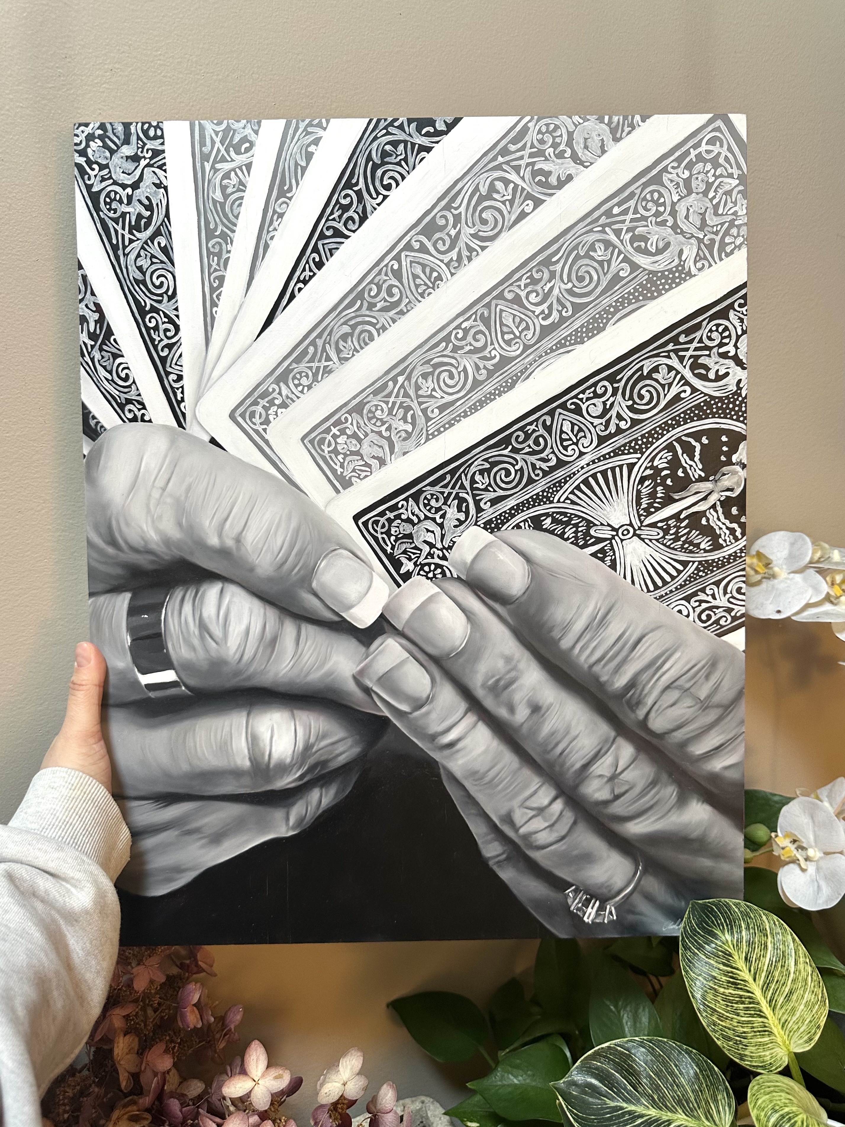 - Woman's hands holding playing cards. Black and white oil painting on canvas by Ashlyn Smith