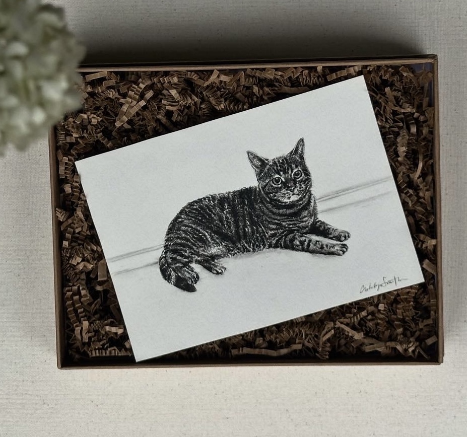 - Black and white charcoal drawing of a cat by Ashlyn Smith. Gift box with filling.